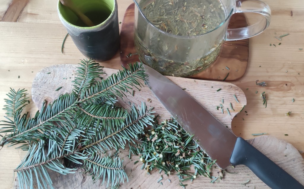 Erstaunlich lecker! Kurz gezogen harzig-aromatisch, länger gezogen kam zu meiner Überraschung ein deutlich frisch-saurer Geschmack hinzu, als hätte ich Zitrone hinzugefügt. Während im Garten alles unter 60 cm Schnee verschwand, fiel mein Blick auf die alte Tanne, deren Zweige so wunderbar nach Orange duften und ich holte ein paar in die Küche.